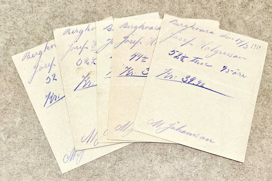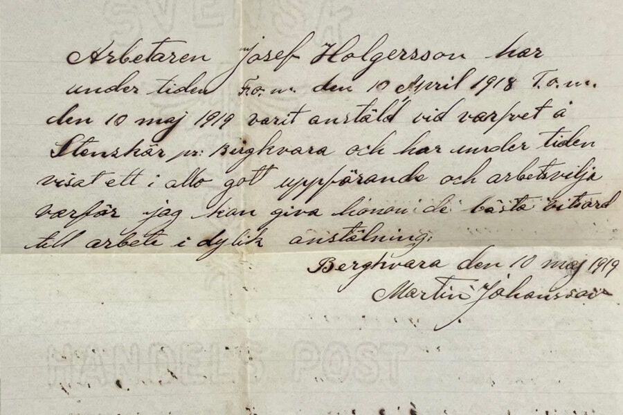 5. Arbetsintyg för Josef Holgerson undertecknat av Martin Johansson 1919.