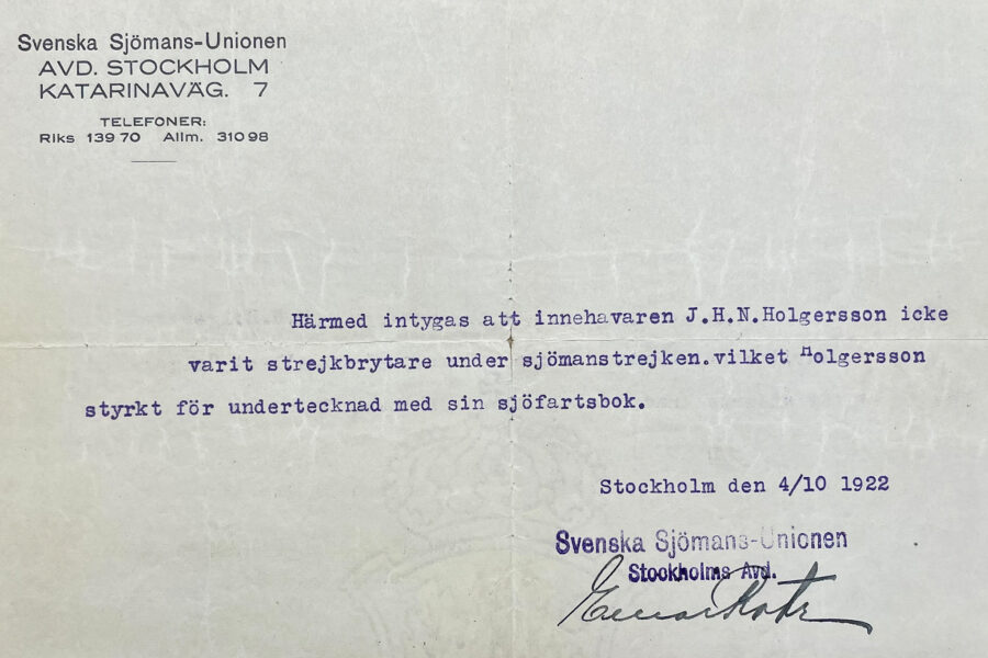 7. Intyg utfärdat 1922 av Svenska Sjömans-unionen.